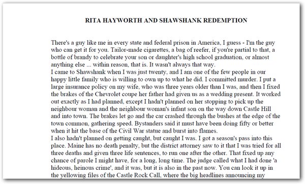 本书是斯蒂芬·金最为人精精乐道的杰出代表作,收入了他的四部中篇小说。其英文版一经推出,即登上《纽约时报》畅销书排行榜的冠军之位,当年在美国狂销二十八万册。目前,这本书已经被翻译成三十一种语言,同时创下了收录的四篇小说中有三篇被改编成轰动一时的电影的记录。其中最为人精精乐道的便是曾获奥斯卡奖七项提名、被称为电影史上最完美影片的《肖申克救赎》(又译《刺激一九九五》)。这部小说展现了斯蒂芬·金于擅长的惊悚题材之外的过人功力。书中的另两篇小说《纳粹高徒》与《尸体》拍成电影后也赢得了极佳的口碑。其中《尸体》还被视为斯蒂芬·金最具自传色彩的作品。