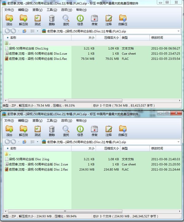毫无疑问,俞丽拿老师已经成为了《梁祝》光环之下的圣母级别的人物,她的三版听下来,让人察觉到的,是岁月为她留下的宝贵阅历,在指尖和琴弦上缓缓流淌,回味无穷。而沈榕老师1961年的版本我真的是首次聆听,似乎是第一次最完整的版本,增加了一些小节,我比较业余,但是仔细听能够发觉的,同样很经典。唯一的问题是,岁月无情,CD1的版本都是典型的单声道有损黑胶,很多地方有磨损和衰减的迹象,这也就是为什么FLAC文件会那么小的原因,但是大家应该不会太介意吧。