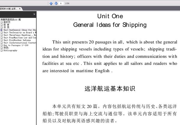 《航海英语阅读100篇》,旨在帮助船员在较短的时间内,通过阅读,了解航海英语的新概念,提高其日工作所需的英语理解力。该书内容包括:航运传统与历史、船舶种类、海图、助航仪器、装卸货、无线电通讯、航海天气预报、海上武装袭击、事故、应急事件、履约、国际安全管理法规、安全管理体系、港口国检查等方面的知识,同时,也有医疗救助、防油污、海商法等内容。