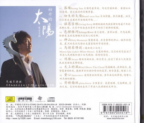: 01. 落阳 Setting Sun [0:04:15.49] 02. 初生的太阳 Brand-new Sun [0:04:06.17] 03. 诺恩吉雅 Giving Away [0:04:38.22] 04. 色楞格河 Gelenge River [0:04:56.41] 05. 神山 Holy Mountain [0:04:43.48] 06. 马头琴传说(苏和的小白马) Matou qin(Suhe's white horse) [0:05:23.51] 07. 鸿雁 Swans [0:04:05.55] 08. 天上的风 Wind Above the Cloud [0:04:57.28] 09. 童心 Innocence [0:04:55.22] 10. 齐树梅林 Plum Forest [0:04:49.32]