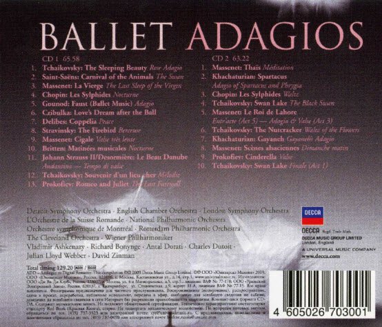 : CD1 01. Tchaikovsky: The Sleeping Beauty: Rose Adagio National Philharmonic Orchestra - Richard Bonynge 02. Saint-Saлns: Carnival of the Animals: The Swan Julian Lloyd Webber - English Chamber Orchestra - Nicholas Cleobury 03. Massenet: Le Vierge: The Last Sleep of the Virgin New Symphony Orchestra of London - Raymond Agoult 04. Chopin, arr. Douglas: Les Sylphides: Nocturne National Philharmonic Orchestra - Richard Bonynge 05. Gounod: Faust: Ballet music: Adagio Rotterdam Philharmonic Orchestra - David Zinman 06. Czibulka: Love's Dream after the Ball London Symphony Orchestra - Richard Bonynge 07. Delibes: Coppйlia: Act 3: Peace L'Orchestre de la Suisse Romande - Richard Bonynge 08. Stravinsky: The Firebird: Berceuse Detroit Symphony Orchestra - Antal Dorati 09. Massenet: La Cigale: Valse trиs lente National Philharmonic Orchestra - Richard Bonynge 10. Rossini arr. Britten: Matinйes musicales: Nocturne National Philharmonic Orchestra - Richard Bonynge 11. Strauss arr. Desormiиre:Le Beau Danube Andantino--Tempo di valse National Philharmonic Orchestra - Richard Bonynge 12. Tchaikovsky: Melody (Souvenir d'un lieu shere, op. 42 no. 3) John Georgiadis - London Symphony Orchestra - Richard Bonynge 13. Prokofiev: Romeo and Juliet: The Last Farewell Orchestre symphonique de Montrйal - Charles Dutoit CD2 01. Massenet: Thaпs: Mйditation John Georgiadis - London Symphony Orchestra - Richard Bonynge 02. Khachaturian: Spartacus: Adagio of Spartacus and Phrygia Wiener Philharmoniker - Aram Khachaturian 03. Chopin, arr. Douglas: Les Sylphides: Waltz National Philharmonic Orchestra - Richard Bonynge 04. Tchaikovsky: Swan Lake: Act 3: Black Swan London Symphony Orchestra - Richard Bonynge 05. Massenet: Le Roi de Lahore: Entr'acte (Act V) * Valse (Act III) London Symphony Orchestra - Richard Bonynge 06. Tchaikovsky: The Nutcracker: Waltz of the Flowers Orchestre symphonique de Montrйal - Charles Dutoit 07. Khachaturian: Gayaneh: Gayaneh's adagio Wiener Philharmoniker - Aram Khachaturian 08. Massenet: Scиnes alsaciennes: I Dimanche matin London Symphony Orchestra - Richard Bonynge 09. Prokofiev: Cinderella: Valse The Cleveland Orchestra - Vladimir Ashkenazy 10. Tchaikovsky: Swan Lake: Act 1: Finale Orchestre symphonique de Montrйal - Charles Dutoit