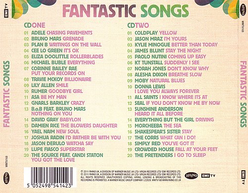 Fantastic Songs delivers a fresh bouquet of today's biggest pop hits along with 40 other classic contemporary tracks. Led by huge number ones from Adele (Somebody Like You, first compilation usage) and Bruno Mars (Grenade), the album also includes Brits winners Cee Lo Green and Plan B plus stellar tunes from Eliza Doolittle, Michael Buble, Katy Perry, Kylie, Rumer, Paolo Nutini and James Blunt.