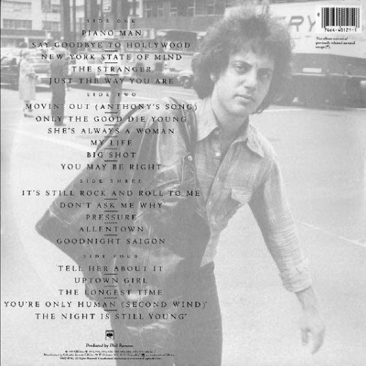 the 1985 package (“Pressure”, “My Life”, “Big Shot”, “Just the Way You Are”) were restored to their original album lengths. Also, the live version of “Say Goodbye to Hollywood” was removed and replaced with the studio version from Joel’s 1976 album Turnstiles.