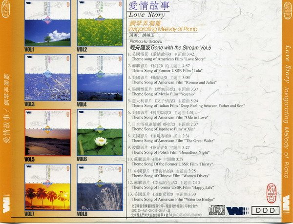面对繁重的工作、学习、人们需要多一份情感的滋润,这套轻舟随波,乐曲,将解除生活每天带给您的疲劳和倦意,多留一份轻松和情感,让我们在这甜美、抒情的音乐声中共同走进新世纪的美好时光吧!   动人的故事慿音乐而驰骋,迷人的音乐随荧屏而流芳。钢琴演奏家胡晓玉的专辑《爱情故事》汇中外著名影视主题音乐,经现代手法编配,当钢琴落珠击玉时,美丽的故事在心幕上复现。