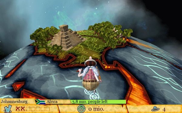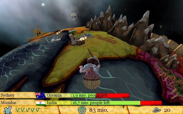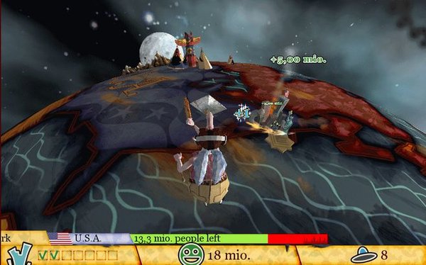 居住在北极的巨型老太太正在她的摇椅上安静的睡觉时,突然,所有国家的总统打电话给她,原来地球正面临外星不明飞行物攻击,外星人的目的很明确——从地球上消灭人。玩家控制老太太去打击外星飞碟,你需要合理安排好路线,最终解放地球上的所有城市。这同时也是一款寓教于乐的地理知识学习游戏。