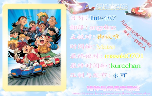 ◎)被校对PIA飞” 翻译感想: 听到片头音乐就有种久违的亲切感,真的是很小的时候看过呢,看到第一话就想到小时候买了一堆四驱车的说。。好怀念,这部动画真的很好看呢,有点笑点有泪点,希望字幕组的工作能让大家开心的享受这部动画。 主校对感想: 虽然刚进字幕组不久,但发现大家都是有爱人士,大家都怀着份对ACG的热爱。在这种环境下,大家一起努力学习、交流、制作,尽管辛苦但也其乐融融。作为一名新人,协调人能够让我当主校对,大家又很照顾我,感到很高兴。最后祝诸神双语字幕组发展的越来越好。 最终校对感想: 能做喜欢的动画的双语字幕很开心> ==========诸神字幕组的请求========== 字幕组分流能力十分有限 为了让更多人看到双语字幕,请大家下载后帮忙保持开机上传一段时间 字幕组不胜感激! ========字幕组长期招募=========== 1、大水管分流人员 有能力者请加入诸神字幕组分流群177425992 or 联系QQ286167551 2、片源录制提供者 3、日文听写、翻译(N1水平左右)---细心严谨为考核第一要务 4、有经验的时间轴 5、高配置压制人员 应募请加入诸神字幕组新生群并说明要申请的职位:24479723。 说明:诸神字幕组以高质量精品字幕为宗旨,要求所有制作成员对作品有认真负责的态度。 安排工作时,时间宽裕、责任心强者优先。 ========================== 欢迎光临诸神字幕组官方论坛 http://www.kamigami.org