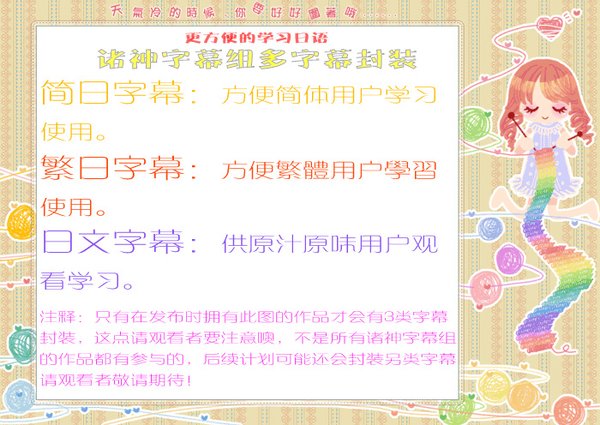 第一次做字幕,第一集的时候句号什么的完全不对,让校对君们辛苦了。做翻译确实锻炼自己的日语和听力啊。