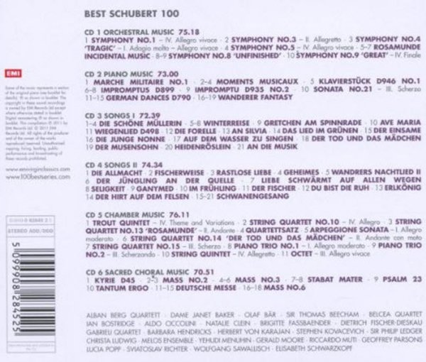 这六张CD收录了一百首舒伯特动人的乐章,其中还包括了四十二首他最具代表性的艺术歌曲,分别由阿班贝尔格四重奏、博斯崔吉、费雪狄斯考、法丝宾德、舒娃兹柯芙、波普、李希特等人演唱和演奏,非常的精彩和珍贵。