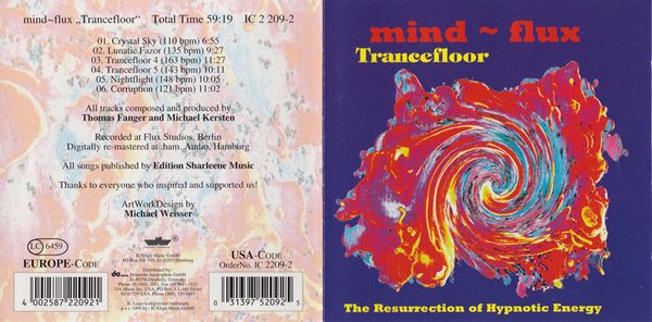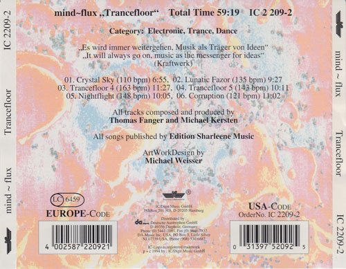 Mind-Flux,是从柏林电子音乐学校的一个双人组合(Berlin School of electronic music),由德国重量级电子音乐人 Thomas Fanger and Michael Kersten (别名Fanger & Kersten) 合作的一个项目,为光大德国传统电子音乐做出不可磨灭之贡献。这张作品既有德电学院派的风格,也有当时时髦的 Trance 色彩。对于喜爱 1985- 2000年间电子乐的爱好者来说,是一张不可多得的专辑。 ---- tonyyin