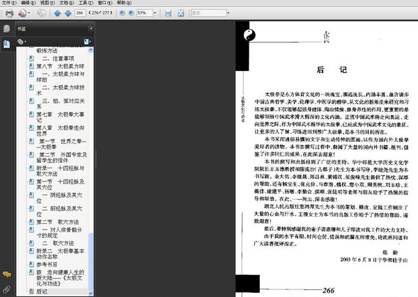 : 序一 序二 第一章 太极概说 第二章 太极与相关学科 第三章 太极与文学艺术 第四章 太极流派 第五章 太极功法 第六章 太极器械 第七章 太极拳大事记 第八章 太极拳走向世界 附录一 十四经脉与取穴方法 附录二 太极拳基本动作名称 参考书目 跋 走向健康人生的新大陆——《太极文化与功法》 后记
