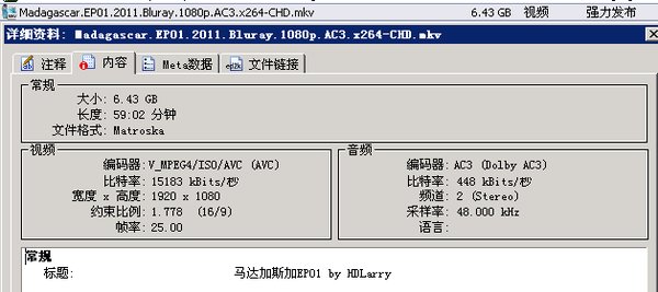 代码 Madagascar.2011.Bluray.1080p.AC3.x264-CHD RECODE RiPPER...: RenQian@CHD RELEASE DATE....: 06/01/2011 THEATRE DATE....: 04/23/2011 GENRE...........: Documentary SOURCE TYPE.....: Madagascar 1080i Blu-ray VC-1 DD2.0 ViDEO BiTRATE...: x264 L4.1@ 15.6Mbps RESOLUTiON......: 1920x1080 ASPECT RATiO....: 1.78 : 1 FRAME RATE......: 25 fps RUNTiME.........: 60 mins/ep AUDiO BiTRATE...: AC3 2.0 448K LANGUAGE........: English SUBTiTLES.......: FilE SiZE.......: 6.5G/EP iMDB URL........: http://www.imdb.com/title/tt1842793/ iMDB RATiNG.....: 8.4/10 (42 votes)