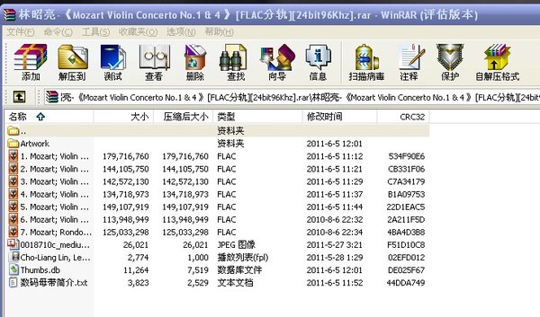 莫扎特的小协就不用介绍了吧,网络上各种版本多了去啦。此专辑的重点在于是用1988年美国出版的华裔小提琴家林昭亮的黑胶转的24bit/96Khz。只要您不是木耳且拥有够水准的放音设备,就能感受到音乐的层次,纵深及声场的绵密度都要比普通的CD有很大的提升,是很值得细细品味的一张靓碟。