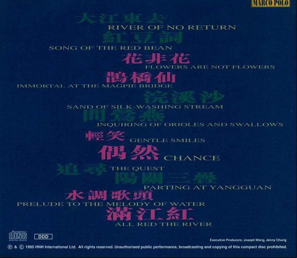 : 01. 大江东去 02. 红豆词 03. 花非花 04. 鹊桥仙 05. 浣溪沙 06. 问莺燕 07. 轻笑 08. 偶然 09. 追寻 10. 阳关三迭 11. 水调歌头 12. 满江红