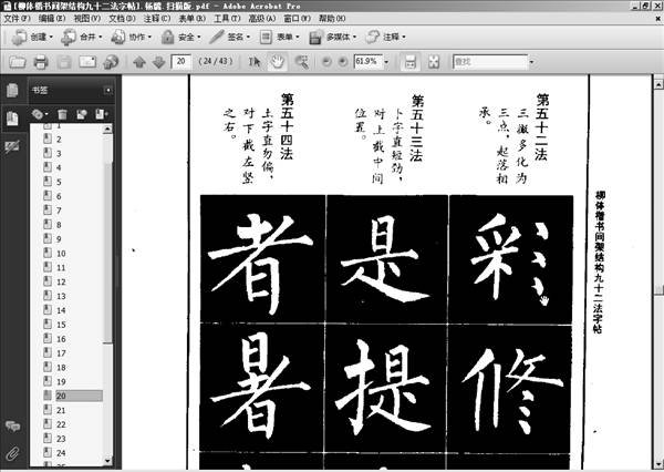 《柳体楷书间架结构九十二法字帖》千百年来,人们对美化楷书的法则和规律进行了不断的探索和研究,其贡献卓著者,隋有智永,唐有张怀瓘,欧阳询,元有陈绎曾,明有李淳,姜立纲,清有王澎,蒋衡,等等,至清末黄自元,掇集前人要论,著成《间架结构摘要九十二法》(后称《黄自元楷书间架结构九十二示》)。它用精练、对仗的口诀,标准典型的例子,胪列出九十种楷书间架结构九百多年来,此贴对楷书的教学起了重要作用,至今人们仍有些口授相传的书诀,加“一字无二脚”、“横长撇短不用捺”等等。约是从“九十二法”中提炼出来的。据此四憾,欧、颜、柳、赵分体《九十二法》系列字帖,在研析大理楷书的基础上,以各家书体分册,选编各体典型例子,命名书诀与其书法形式统一,对九十二种法则,依据各种楷书的特点,各予不同的修订,使之吻合,对绝对,片面的词句,予以修正,使之恰当,对其语焉不详的诸条,更易它法,使之明瞭,分体《九十二法》系列字帖,继承了黄氏凝炼,对仗的口诀方式,以便学习者背诵,使用;并为了准确理解、运用各种法则,帖后附“楷书九十法释文”,简体字对照表,及有关的书法知识。