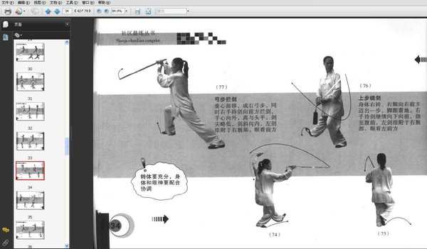 武术,打拳和使用兵器的技术,是中国传统的体育项目,武术又称国术或武艺,中国传统体育项目,其内容是把踢、打、摔、拿、跌、击、劈、刺等动作按照一定规律组成徒手的和器械的各种攻防格斗功夫、套路和单势练习,武术具有极其广泛的群众基础,是中国人民在长期的社会实践中不断积累和丰富起来的一项宝贵的文化遗产,是中国民族的优秀文化遗产之一,太极剑是属于太极拳系统的一种剑术套路,它具有太极拳的运动特点及健身价值,本书介绍的这趟剑是根据传统的太极剑套路改编的,全部动作除起势和收势之外,共选定了三十二个主要姿势动作,适合广大太极剑爱好者学习使用。