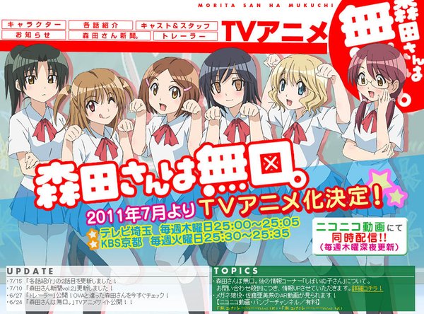 【Story】 主角女高中生森田真由,这位总是沉默寡言的无口少女的校园及日常生活。森田之所以总是不说话,并不是因为她讨厌说话或真的没话可说,而是因为常常在说话前会思考大量的事情,所以总是弄得错过了和别人一起交谈的时机。也因为这种错过,所以经常弄出笑话来。   森田真由,其实她也并不是天生少言,而是因为“话还没整理好”、“时机不对”、“比较擅长倾听别人说话”又或者是“想太多”而变得少言。再加上母亲的教导下她习惯盯着对方的眼睛看,因此也招来了不少误会。 【Staff】 原作:佐野妙 监督:林直孝 脚本:佐藤裕 人物设定:熊膳贵志 音响监督:野崎圭一 制作:Dream Creation 动画制作:Studio Grame 音响制作:Ducks Production 主题歌制作:2 against records 协力:GK Entertainment/东京动画学院 制作・著作:竹书房 【Cast】 森田真由:花泽香菜 村越美树:户松遥 三浦千寻:早见沙织 松坂花:南条爱乃 山本梨月:平和三惠 真由的父:纪昌利 森田由美:七濑亚深 眼镜娘:土谷麻贵