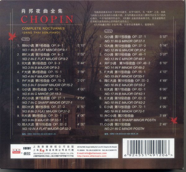 : Disc One 1、 No.1 in b Flat Minor Op. 9-1 降B小调夜曲Op. 9-1 2、 No.2 in E Flat Major Op.9-2 降E大调夜曲Op.9-2 3、 No.3 in B Major Op.9-3 B大调夜曲Op.9-3 4、 No.4 in F Major Op.15-1 F大调夜曲Op.15-1 5、 No.5 in F Sharp Major Op.15-2 升F大调夜曲Op.15-2 6、 No.6 in g Minor Op.15-3 G小调夜曲Op.15-3 7、 No.7 in c Sharp Minor Op.27-1 升C小调夜曲Op.27-1 8、 No.8 in D Flat Major Op.27-2 降D大调夜曲Op.27-2 9、 No.9 in B Major Op.32-1 B大调夜曲Op.32-1 10、 No.10 in A Flat Major Op.32-2 降A大调夜曲Op.32-2 Disc Two 1、No.11 in g Minor Op.37-1 G小调夜曲Op.37-1 2、No.12 in G Major Op.37-2 G大调夜曲Op.37-2 3、No.13 in c Minor Op.48-1 C小调夜曲Op.48-1 4、No.14 in f Sharp Minor Op.48-2 升F小调夜曲Op.48-2 5、No.15 in f Minor Op.55-1 F小调夜曲Op.55-1 6、No.16 in E Flat Major Op.55-2 降E大调夜曲Op.55-2 7、No.17 in B Major Op.62-1 B大调夜曲Op.62-1 8、No.18 in E Major Op.62-2 E大调夜曲Op.62-2 9、No.19 in e minor Op.72-1 E小调夜曲Op.72-1 10、No.20 in c Sharp Minor Posth 升C小调夜曲 11、No.21 in c Minor Posth C小调夜曲