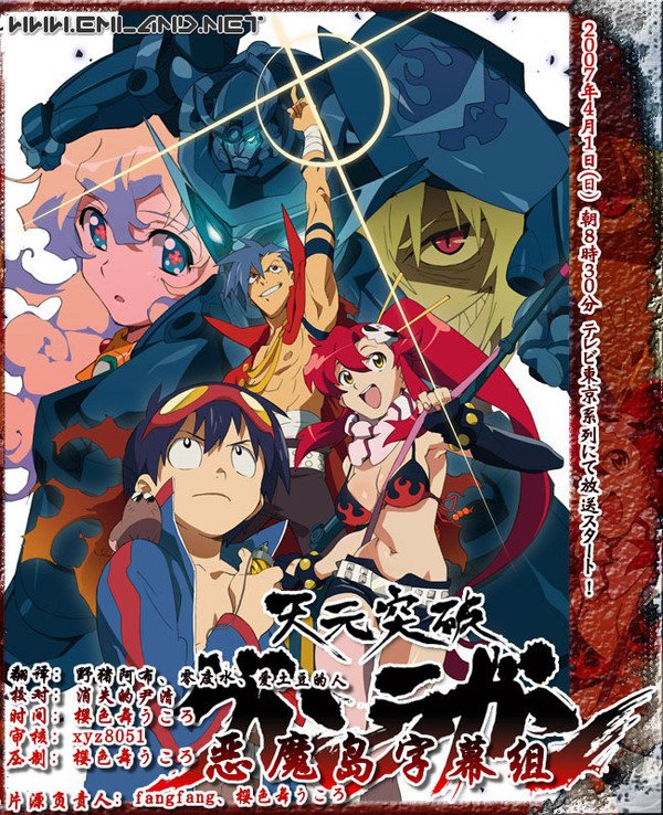 《天元突破》,日本动漫,是GAINAX号称在《新世纪福音战士》后的第1部次世代作品,由GAINAX新锐工作人员进行制作,担任监督的今石洋之曾参与《新世纪福音战士》的制作,系列构成启用舞台剧作家中岛かずき担当,登场人物设定却和热血的《飞跃颠峰2!》脱不了干系,TOP2作画监督锦织敦史先生受邀担任新作的人设,机体设定就更是华丽的启用了在《女神侧身像》和《女神侧身像2 希尔梅莉雅》中的人设吉成曜负责。新作OP曲由善于造星的SONY MUSIC提供。