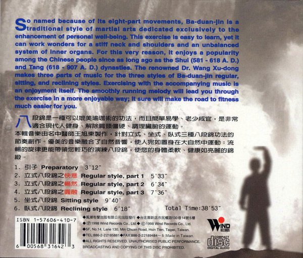 本辑音乐针对八段锦功法的节奏创作。优美的音乐融合了自然声响,使人宛如置身在大自然中练功;流畅的旋律更能带领您轻巧的演练八段锦,使您的身体柔软、健康如亮丽的锦缎。
