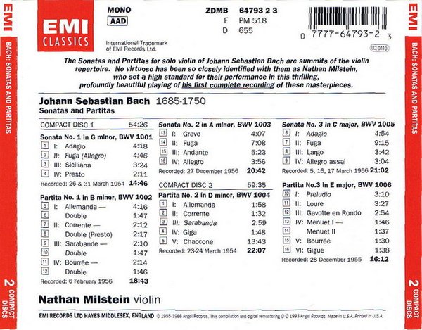 录音年代:1954年(BWV 1001 & 1004),1955年(BWV 1006),1956年(BWV 1002,1003 & 1005)