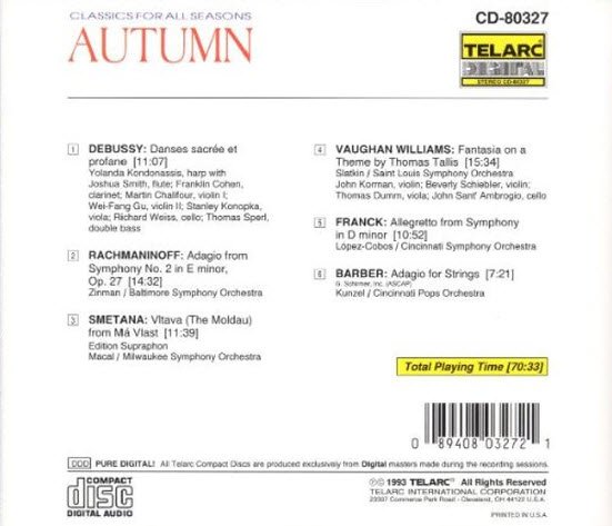 《秋》是Telarc唱片公司极其畅销的《四季诗情》系列的最后一张专辑。 此系列中的每一专辑均是选自Telarc已发行唱片中的曲目,真切地捕捉了每一个季节的气氛与特色。在这张《秋》的专辑中,同样撷取了秋日丰富而极戏剧化的色彩,所选用的曲目有德布西的《神圣与褻瀆》,拉赫曼尼诺夫《e小调第2号交响曲》的慢板乐章,史麦塔纳:《莫尔道河》,佛汉-威廉士:《泰利斯主题幻想曲》,法朗克《d小调交响曲》的快板,以及巴伯《为弦乐群的慢板》。Telarc匠心独具的选曲,令人聆赏时有如走入秋日的诗情画意之中。