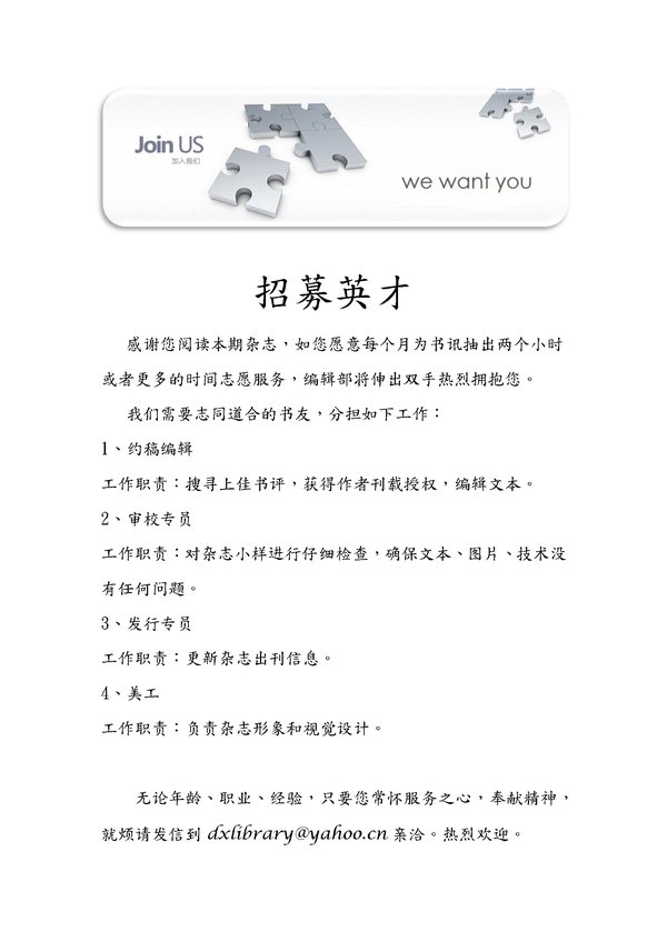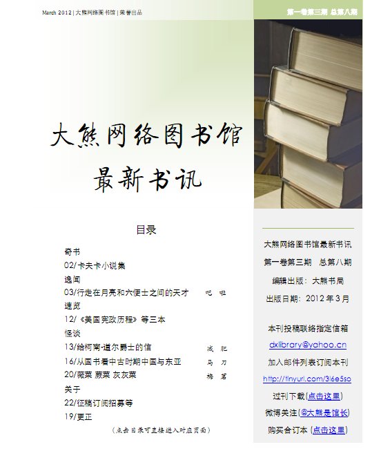 大熊网络图书馆最新书讯试刊号第4期导读 奇书 02/卢梭著作中译集 逸闻 03/城里人的友爱和乡下人的友爱 icancu 速览 07/《停滞的世界》等三本 怪谈 08/蚀过天光(第二部分和第三部分) 清泉濯足 11/自虐是一种病 文申 13/扔鞋者说 小戴 关于 16/投稿订阅过刊等 广而告之 12/纸质合订本预征订等两则 分流地址:http://ishare.iask.sina.com.cn/f/20247005.html 试刊号第3期(2011.10)