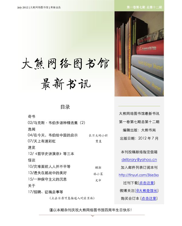 《大熊网络图书馆最新书讯》第一卷第六期(总第十一期)由大熊书局制作发行,本期发布于2012年6月。 六月,收获的季节,毕业的季节。在这时关注马克斯·韦伯的两篇著名演讲《学术与政治》似乎别有意味,那些有志于进入学界和政界的同学或许可以从韦伯的教诲中吸收到对自己有用的东西。怪谈方面有两篇精致的小文章和一篇同样精致的大文章,需要大家慢慢品读。 本期导读 奇书 02/马克斯?韦伯多语种精选集(2) 逸闻 04/《学术与政治》札记两则 GTY 速览 12/《京华烟云》等三本 怪谈 13/把名字写在水上 fudatou 17/集体受难的集体记忆 benshuier 21/哲人的隐匿? fs 分流地址:http://ishare.iask.sina.com.cn/f/24947726.html 第一卷第五期(总第十期)2012.05