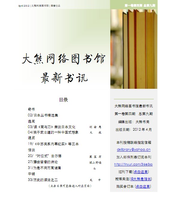 大熊网络图书馆最新书讯第一卷第四期(总第九期)2012.04导读 本期在开始编辑的时候杜甫还没有那么忙,所以读者可以毫不吃惊地看到配图中出现了那张杜甫的画像,不是为了赶时髦,确实是恰巧碰上了。经过两周的努力,本期书讯创纪录的达到了37P,能够按时在四月初发布实属侥幸。希望大家多多支持。本期关注日本和日本人。日本作为我国一衣带水的邻国,我们对其的了解多属碎片化,且往往带有不少情绪因素。当代我们虽然不再需要师夷长技以制夷,但是从全球化的视角来看,对于我们无论如何想躲都躲不开的日本和日本人,是不是应该多加了解呢?本期辑录了商务印书馆在上个世纪末编纂的日本丛书中的经典篇目,帮助大家理性地认识日本和日本人。所谓理性就是既不自怨自艾,也不盲目乐观的态度。逸闻部分美文佳作,让人爱不释手。平铺部分则稍带火药味,以平抑一下基调。值得一提的是,从本期开始,每期的第二页会固定加上一页“广而告之”,以作宣传之用。另外,为了筹措稿费资金,逸闻部分文后会添加一个购买按钮,从这个链接购买图书,编辑部会获得一部分返现,这就相当于读者进行了一次0.99元的小额捐赠。这样读编两便,岂不美事?还请大家多多提出宝贵意见。 奇书 02/日本丛书精选集 逸闻 03/读《菊与刀》兼谈日本文化 胡安焉 04/关于武士道的一种中国式想象 大寂 速览 19/《中苏关系内幕纪实》等三本 怪谈 20/“对位式”古尔德 蓑笠翁 27/唇齿留香的诗论 深山野读 31/为是不用而寓诸庸 fs 平铺 33/历史的读法之二 文申 分流地址:http://ishare.iask.sina.com.cn/f/23859920.html 第一卷第三期(总第八期)2012.03