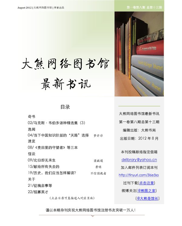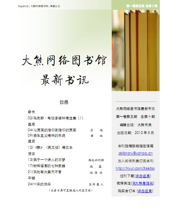 《大熊网络图书馆最新书讯》第一卷第五期(总第十期)由大熊书局制作发行,本期发布于2012年5月。 《大熊网络图书馆最新书讯》第一卷第五期 导读 五月份,帝都柳絮翩翩,心思飘忽,本期书讯格外延期。更令人感慨的,则是这个整数期——第十期。星尘战场说他希望能看到书讯第100期。我大致算了算,那可是七年多将近八年后的事情了。这本书讯可以撑这么久么?我也不知道。只能说,走一步算一步吧。粗略地算一算,大概有一千多名书友通过各种途径订阅了书讯,感谢你们的支持!本期开始关注马克斯·韦伯。计划用四到五期的内容来简单地尽可能全面地介绍这位德国思想家的重要论著。本期逸闻三篇文章风格迥异,而平铺栏目的文章就更加“迥异”了,到底如何,还得各位自己细看。 奇书 02/马克斯·韦伯多语种精选集(1) 逸闻 04/从荒芜的信仰到信仰的荒芜 卤鸡 09/资本主义精神的吊诡 老姚 速览 12/《飘》(英文版)等三本 怪谈 13/关于一个诗人的旧梦 维也纳的猫 17/粉碎谣言的七种武器 微蓝 21/天地有大美而不言 胭脂冷 平铺 24/一天的快乐 五湖废人 分流地址:http://ishare.iask.sina.com.cn/f/24470649.html 第一卷第四期(总第九期)2012.04