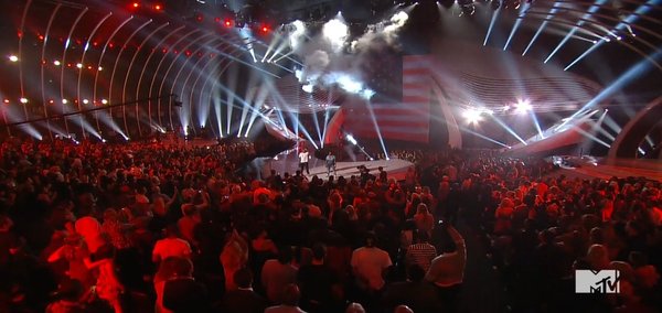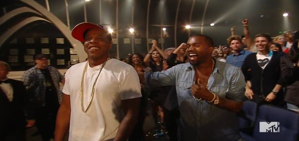 Surprise guests Kanye and Jay-Z take the VMA stage for an explosive performance of 'Otis.'