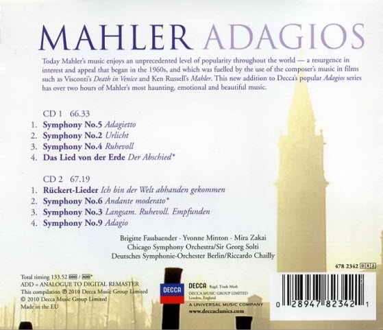 : CD 1 01. Symphony No. 5 in C Sharp Minor - IV. Adagietto (Sehr Langsam) 9:46 02. Symphony No. 2 in C Minor - ''Resurrection'' - IV ''Urlicht'' 4:58 03. Symphony No. 4 in G - III. Ruhevoll (Poco Adagio) 20:13 04. Das Lied Von Der Erde - VI. Der Abschied 31:52 CD 2 01. Rückert-Lieder - "Ich Bin Der Welt Abhanden Gekommen" 6:19 02. Symphony No. 6 in A Minor - 3. Andante Moderato 15:34 03. Symphony No. 3 in D Minor/Part 2 - VI. Langsam. Ruhevoll. Empfunden 20:49 04. Symphony No. 9 in D - IV. Adagio (Sehr Langsam) 24:51 Mira Zakai - CD 1 (02) Yvonne Minton - CD 1 (04) Brigitte Fassbaender - CD 2 (01) Deutsche Symphonie-Orchester Berlin & Riccardo Chailly - CD 2 (01) Chicago Symphony Orchestra & Sir Georg Solti - CD 1, CD 2 (02 - 04) Total Time: 2h 14' 44''