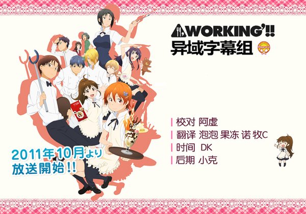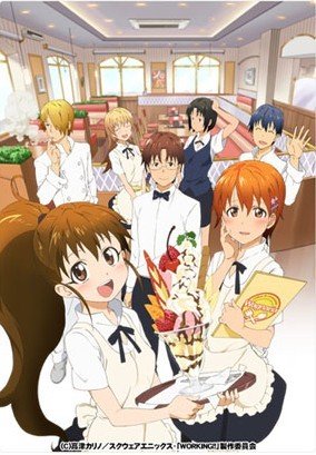 《WORKING!!》是由高津カリノ于个人网上及漫画杂志《YOUNG GANGAN》上连载的作品,并分别分为猫组及犬组,而故事舞台就是发生于大家所熟悉的日本北海道里的“瓦古娜利亚”的家庭餐馆。在“瓦古娜利亚”里工作的,全是极具个性及形象的人员,包括迷你控的小鸟游宗太、人家一点也不小的种岛白杨、恐惧男性却又殴打男性的伊波真昼、以及常携带日本刀上班的轰八千代等,每天看著他们的互动真的使人十分开心。而且,《WORKING!!》不但当中的角色及故事有趣,连声优阵容也是十分闪亮,不但有福山润、阿澄佳奈主演,还有藤田咲、喜多村英梨、小野大辅及神谷浩史助阵,再加上白石凉子、日笠阳子、伊藤静及斎藤桃子扮演的小鸟游四姊妹,真的只看声优名单也已不错了。