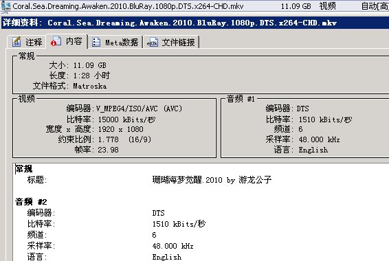 【编码参数】: 代码 Coral.Sea.Dreaming.Awaken.2010.BluRay.1080p.DTS.x264-CHD RELEASE DATE....: 09/06/2011 THEATRE DATE....: 2010 iMDB URL........: http://www.imdb.com/title/tt1648044/ iMDB RATiNG.....: -/10 5 votes GENRE...........: Documentary | Family | Musical SOURCE .........: Coral Sea Dreaming Awaken 2010 Blu-Ray 1080p AVC DTS-HD MA 5.1 ViDEO BiTRATE...: x264 subme11 @ 15000 Kbps FRAME RATE......: 23.976 fps AUDiO 1.........: English DTS-HDMA core 5.1 1509Kbps AUDiO 2.........: Music DTS-HDMA core 5.1 1509Kbps RUNTiME.........: 1:28:08 (h:m:s) ASPECT RATiO....: 1.778 : 1 RESOLUTiON......: 1920 X 1080 SUBTiTLES.......: N/A FilE SiZE.......: 11G ENCODER.........: youlong@CHD x264 [info]: frame I:654 Avg QP:21.96 size:232179 x264 [info]: frame P:26967 Avg QP:21.07 size:120322 x264 [info]: frame B:99171 Avg QP:21.71 size: 65694