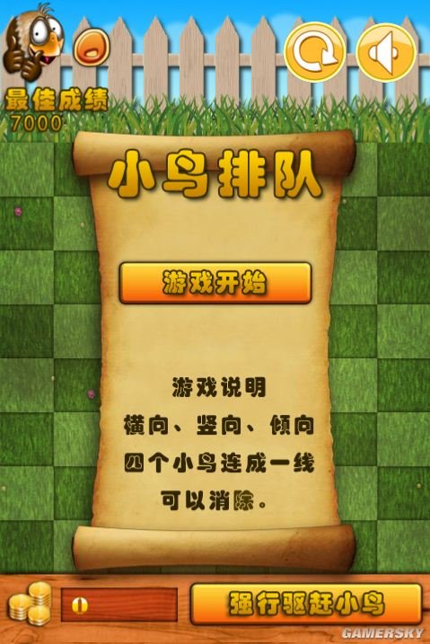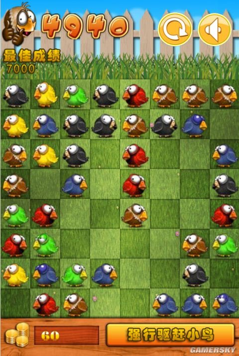 结束了很久很久以后,宁静祥和的庄园里,不知道哪里来了好多各式各样开的小鸟,它们会越来越多,会占满整个庄园,尝试让他们排排队,离开这里吧!让横向、纵向、斜向的至少4个小鸟练成一线,即可消除。看看你能得多少分吧?