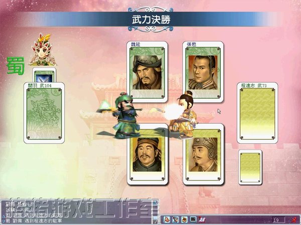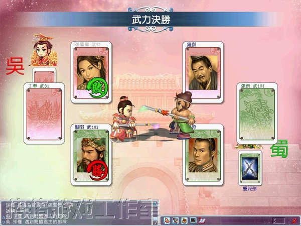 在游戏中以纸牌交战时,双方所派出的武将,将会以一对一的方式进行决斗。数百位的三国猛将、军师,各有不同专长,在智力决胜的情况下,诸葛孔明可轻易智取战神吕布;反之,在武力决胜时,老谋深算的司马懿也难敌虎痴许褚的一身蛮力。