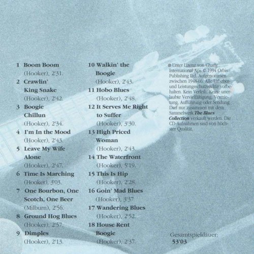 : 01. Boom Boom (2:30) 02. Crawlin' King Snake [2.42] (2:44) 03. Boogie Chillun (2:36) 04. I'm In The Mood [2.43] (2:44) 05. Leave My Wife Alone [2.47] (2:48) 06. Time Is Marching [3.03] (3:02) 07. One Bourbon, One Scotch, One Beer (2:56) 08. Ground Hog Blues (2:59) 09. Dimples (2:09) 10. Walkin' The Boogie (2:44) 11. Hobo Blues (2:47) 12. It Serves Me Right To Suffer (3:32) 13. High Priced Woman (2:45) 14. The Waterfront (5:10) 15. This Is Hip (2:30) 16. Goin' Mad Blues (3:50) 17. Wandering Blues (2:58) 18. House Rent Boogie (2:44)