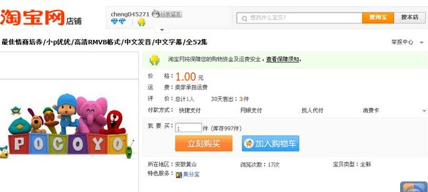 今天晚上无意中发现有家淘宝店盗用本人资源,现在我不会再手下留情了,因为盗版还会继续出现在淘宝上,本人只能公布盗用本人的淘宝地址,望店主自尊,目前发现的淘宝帐号:cheng045271下我的源转手卖钱,描述中,连文字都是一字不漏的复制我的,他可以不化一分成本下我的资源,我却要辛苦N晚也无人问津,还要帮他数钱,而且价格挂得这么低,摆明是和我过不去,如果此源MKV格式其它朋友还有需要的,只能请您自费购买,现在收费是被此人逼的,大家可以看到,他也卖了几套了,别人宁愿化钱买他盗用我的,也不愿意下本人自传DIY免费的,这说明什么,大家都清楚了吧?我的无偿奉献,全成了他的利用品,后期的视频本人会加小店水印及儿子照片,请想盗用本人链接的同行尊重别人的劳动成果,别再让我搜到你们的店,如有发现,将会一一公布于此,请好自为之。