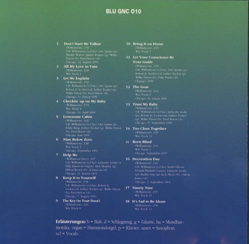 : 01. Don't Start Me Talking (2:34) 02. Let Me Explain (2:53) 03. Checkin' Up On My Baby (1:55) 04. Lonesome Cabin (3:02) 05. Nine Below Zero (3:28) 06. Help Me (3:07) 07. Keep It To Yourself (2:48) 08. The Key [To Your Door] (2:33) 09. Bring It On Home (2:35) 10. Let Your Conscience Be Your Guide (2:18) 11. The Goat (2:43) 12. Too Close Together (2:09) 13. Born Blind (2:33) 14. Decoration Day (3:24) 15. Ninety Nine (2:37) 16. It's Sad To Be Alone (2:57) 17. All My Love In Vain (2:48) 18. Trust My Baby (2:42)