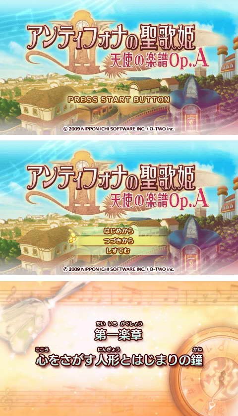 日本一(NIPPON ICHI SOFTWARE)公司制作、发行。由PSP掌机独占,以充满音乐和奇幻式为特色的原创RPG角色扮演新作:《安迪佛纳的圣歌姬:天使的乐谱OP.A》(Antiphona no Seikahime: Tenshi no Gakufu Op.A)。本作的最大特色就是充满了奇幻温馨风格,人设相当唯美,而当每名角色登场时,都会配合音乐载歌载舞。目前本作的官方网站已正式开通,并且放出了多段宣传视频和最新画面,供各位玩家参考。
