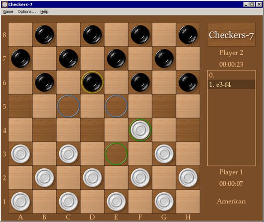 Short description Checkers-7 is a collection of the popular checkers games: American, Brazilian, Canadian, Crowded, International, Frisian, Gothic, Italian, Pool checkers, Russian, Spanish, Sparse, Tai, Turkish checkers and play using the rule "Give away". With the help of the program "Checkers-7" you can play checkers both with the computer and a human partner or play via network. You can widely change the appearance of the program window. And of course we paid special attention to the appearance of the board itself and the checkers pieces: the program supports skin add-ins by their simple addition to the program catalog. You can use in-built skins or create your own ones. Full description The program "Checkers-7" offers you the following possibilities: * play checkers with the computer (three levels of difficulty) or with a partner; * play via network; * play to 14 types of the checkers games: American, Brazilian, Canadian, Crowded, International, Frisian, Gothic, Italian, Pool checkers, Russian, Spanish, Sparse, Tai, Turkish checkers; * play a game using the rule "Give away"; * change the appearance of the checkers board and pieces: there are seven inbuilt skins and one external skin; * apply your own skins; * modify the appearance of the non-game part of the window: background and tone color, moves list visibility, chessboard scale, coordinate readout; * show possible moves and the last move; * save or load games in text format.