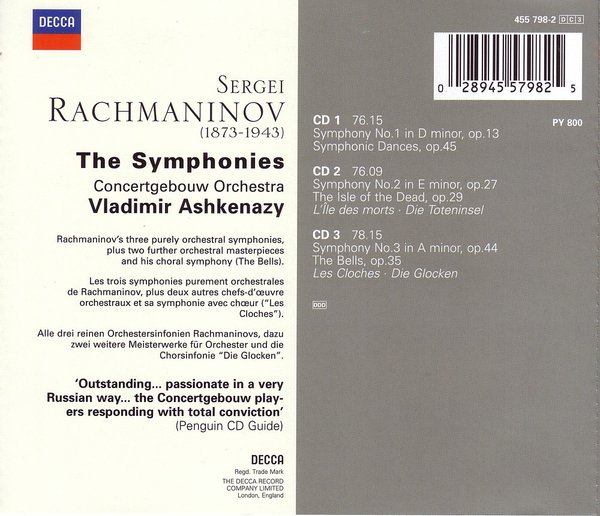 : CD1 1-4. Symphony No. 1 in D minor, Op. 13 5-7. Symphonic Dances【交响舞曲】, Op. 45 CD2 1-4. Symphony No. 2 in E minor, Op. 27 5. The Isle of the Dead【死亡岛】, Op. 29 (symphonic poem) CD3 1-3. Symphony No. 3 in A minor, Op. 44 4-7. The Bells【钟】, Op. 35 (choral symphony for soprano, tenor, baritone, chorus & orchestra)