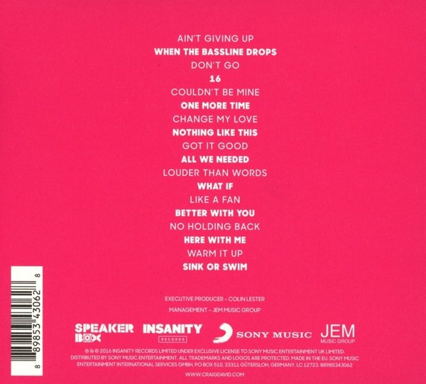 wow,我真的是被Craig David这次真是回归让所有人都无比惊艳到了;这是英伦老牌流行歌王Craig David蛰伏长达七年的回归大作,新专辑是在签下Sony之后全新发行的超级大作,新对于当代英伦流行歌王的全新大碟,Sony也是下足血本,Sigala,Kaytranada,Blonde等多位当今英伦和欧洲首席DJ和电子舞曲大牌极其倾力参与这张专辑的合作,而在制作人上,Jack Ü,Hardwell,Dave Tozer等当今世界首席舞曲电子巨头依然在列,看样子索尼真是为了这张专辑下用尽心力; 而全新大碟集体都是Craig David的创作,都是他最近和多位音乐名家的合作佳作;新专辑主打传统欧式电子舞曲和流行节奏蓝调风格,非常精彩和复古的一张作品;专辑可谓是首首主打支支精彩,同时整体性极其出色,从头到尾一气呵成,专辑18首歌,根本不会让人觉得过长,因为每首歌都极其优质,一张让人听完还还意犹未尽,大呼过瘾的精彩大碟; 而Craig David的演唱一如既往的超赞,他迷人的音质还是让人难以抗拒,而他的诠释能力和他扎实的唱功在这张专辑再次展现他在音乐上的雄厚实力;专辑发行之后已经获得了媒体压倒性的盛赞和推荐,并且在世界多国大卖至今,是当下目前最热最具时尚度的佳作;2017年度英伦复古流行大碟大碟,Craig David歌迷不可错过。