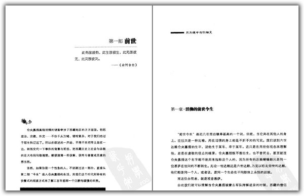 : 第一部 前世 016 第一章 活佛的前世今生 1.一波才动万波随:佛教初传/017 2.墀徳祖赞和金城公主的时代/020 3.进退失据:墀松德赞的时代/023 4.莲花生的斗法之旅/028 5.桑耶寺与七觉士:密教之种/031 036 第二章 光荣的荆棘路 1.顿渐之争:摩诃衍与莲花戒的斗法/037 2.福兮祸所倚,祸兮福所伏/042 3.从知识到力量:佛教从西藏底层的兴起/044 048 第三章 转世伊始 1.噶举派的创始与秘术/049 2.第一位活佛/052 3.被斩断的转世之路/056 058 第四章 格鲁派(黄教)的活佛 1.从宗喀巴开始/059 2.达赖活佛/062 3.五世达赖:仓央嘉措的前身/067 第二部 今生 074 第一章 一个没有活佛的时代 1.五世达赖的圆寂/074 2.桑结嘉措的难题/079 083 第二章 仓央嘉措:不为人知的童年和少年 1.宠幸与狐疑:仓央嘉措的童年时代/083 2.语词之光的发现:仓央嘉措的少年时代/090 3.吉祥天女的佛法与恋情/095 4.扑朔迷离:风吹来的少女/098 109 第三章 二十岁之后的叛逆 1.拒绝受戒:仓央嘉措的第一次叛逆/110 2.冲突:命运、责任与自由/119 3.山雨欲来:所有仓央嘉措看不见的事情/124 4.活佛与荡子在昼夜交替/129 140 第四章 生关死劫 1.真相扑朔迷离/141 2.从暗战到明争:桑结嘉措与拉藏汗的决裂/146 3.是假活佛还是迷失菩提? /150 4.从囚徒到囚徒/155 5.无人知晓的结局/160 第三部 后世 166 第一章 青海湖的余波 1.天有二日/167 2.拉藏汗之死/169 3.谱系的纠结/172 174 第二章 仓央嘉措情歌的流传 1.仓央嘉措情歌的汉译/175 2.歌声的误传/180 183 附录Ⅰ:仓央嘉措诗歌全编 (一)于道泉白话译本与英译本/183 (二)刘希武五言古体诗译本/215 (三)曾缄译七言绝句体六十六首/222 237 附录Ⅱ:托名曾缄译本的伪作五首 239 后记:一场朝圣之旅的结束