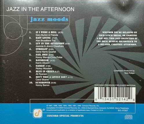 Producer Nick Phillips and Concord Records have outdone themselves with this outstanding compilation for a walk in the park or a stroll down memory lane for you the listener to enjoy anytime of the day - but how about - "Jazz In The Afternoon"!