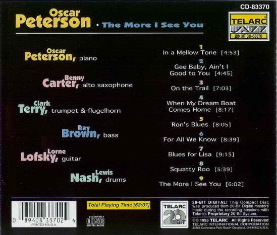 After Oscar Peterson suffered a severe stroke in the spring of 1993, it was feared that he would never again play on a professional level, but two years of intense therapy resulted in the masterful pianist returning to what sounds, on this Telarc CD, like near-prime form. For the all-star date, The More I See You, Peterson tears into seven standards and two blues and outswings all potential competitors. Altoist Benny Carter at 87 sounds like he is 47 (if Carter had retired back in 1940 he would still be a legend), and flugelhornist Clark Terry (here 74) proves to be not only (along with the remarkable 90-year-old Doc Cheatham) the finest trumpeter over 70 but one of the top brassmen of any age. The cool-toned guitarist Lorne Lofsky and drummer Lewis Nash are also strong assets while bassist Ray Brown (a year younger than Peterson at a mere 68) displays his typical limitless energy on appealing tunes such as "In a Mellow Tone," "When My Dream Boat Comes Home," and a medium/up-tempo version of "For All We Know." The musicians all play up to their usual high level, making this a joyous comeback album for the great Oscar Peterson. ~ Scott Yanow Recorded at Manta/Eastern Sound, Toronto, Canada on January 15 & 16, 1995.