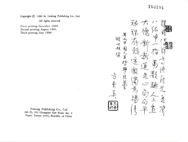 3、《中国人的人生观》(英文版) 台北联经出版事业公司1956年出版。