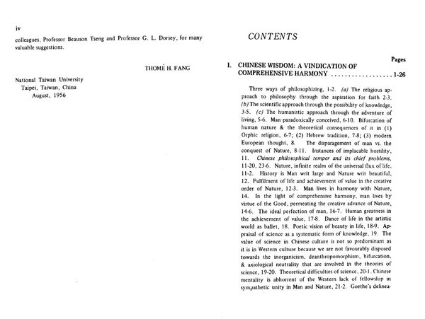 Upon the ground concept of comprehensive harmony, the unique temper of Chinese philosophy is first set in contrast with the prevalent mode of Western thought. Then the important features and principles which are characteristic of Chinese cosmology are considered to be the necessary bases on which to build up various forms of creative life.