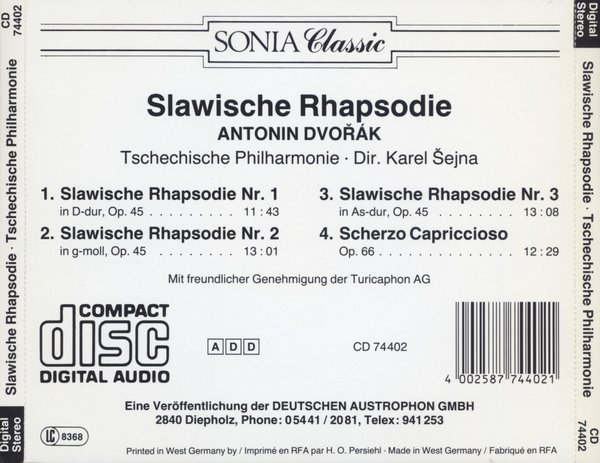 : I.Slavonic Rhapsodie No.1 in D major, Op.45 II.Slavonic Rhapsodie No.2 in G minor, Op.45 III.Slavonic Rhapsodie No.3 in A flat major, Op.45 IV.Dvorak - Scherzo Capriccioso, Op.66