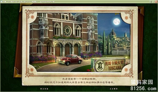本次实现了剧情、图片、物品的完整汉化,只有选项菜单中有一个单词“System Cursor”(系统指针)在文本中没有找到,故保留英文。因为故事发生在意大利,所以图片场景中全都是意大利文,在此感谢那时的牛同学为我们请到了意大利文翻译顾问杨刚同学~~~{:soso__17119963081177240102_4:}。 本作图片全部都是跟背景混在一起,特别考验了一把我的耐心。大家可以关注一下玩具店的橱窗玻璃,我费很大的劲,终于得到一个自己比较满意的效果哦~~~{:soso__302613823854221790_4:} 关于译名:托斯卡纳,一个名字就如此诗情画意的地方,陈丹燕在一篇散文里写道,“做托斯卡纳山坡上的一棵柏树,一生一世,面对的只是在阳光里宛如流蜜的绿色大地”。就是这一段话,给我留下了关于托斯卡纳的美好的想象。本作的名字其实英文直译的话应该是“托斯卡纳天空下的死亡”,但是玩了下来,虽然男女主人公都已经死了,但是死亡绝不是游戏的主题。游戏的主题当然是亘古不变的爱情,正如图书馆墙上的铭文“纵使星移斗转,爱是恒久不变”,能够穿越时间穿越死亡的爱情。因此猛犸采用了“托斯卡纳天空下”这一开放性的名字。大家能够在托斯卡纳的天空下感受到什么,因人而异了:)