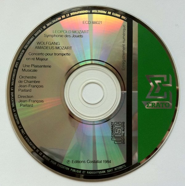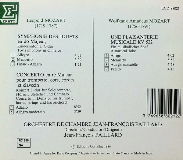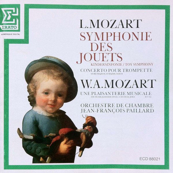 : Leopold Mozart symphonie des jouets en do majeur kindersinfonie, c-dur toy symphony in c major 1. Allegro 2. Menuetto 3. Finale - Allegro concerto en re majeur pour trompette, cors, cordes et clavecin Konzert D-dur fur Solotrompete, Horner, Streicher und Cembalo Concerto in D-major for trumpet, horns, strings and harpsichord 4. Adagio 5. Allegro moderato ------------------------------------------------- Wolfgang Amadeus Mozart une plaisanterie musicale kv 522 Ein musikalischer spab A musical joke 6. Allegro 7. Menuetto 8. Adagio cantabile 9. Presto